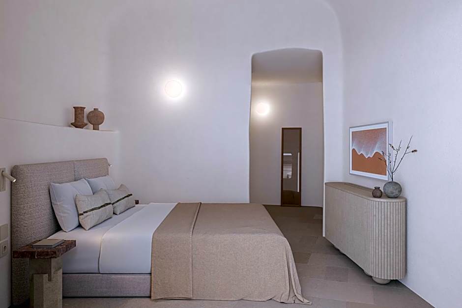 The River pool suite features a magnificent bedroom with separate living room and a bathroom with a rain shower. The highlight of the suite is the river pool plunge pool where you can have your Santorini cave moments and relish the endless views.
